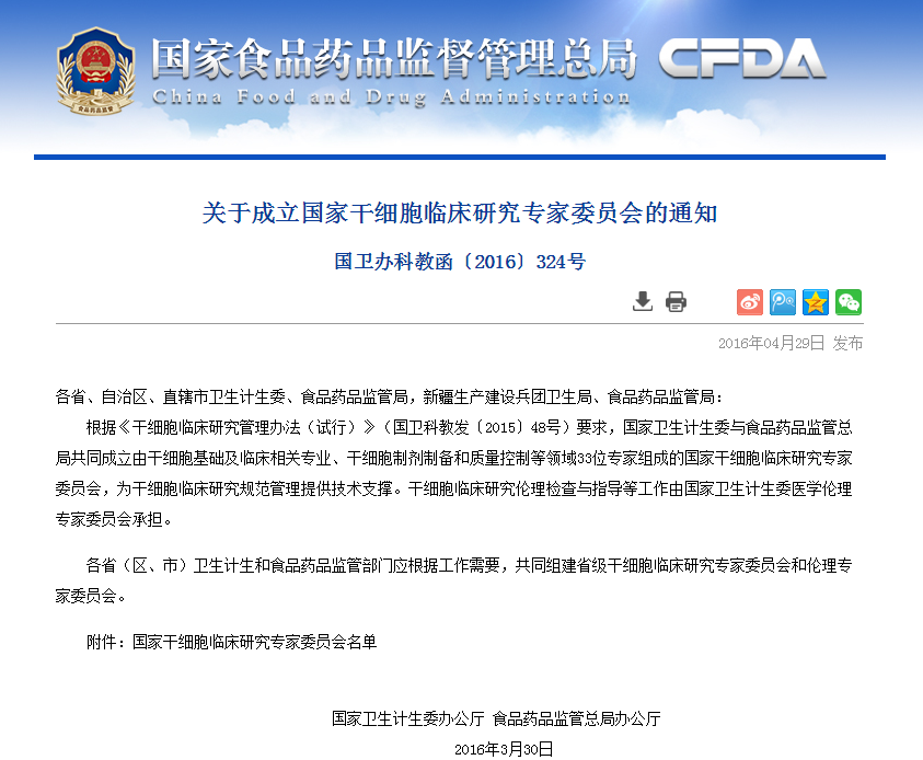各省、自治區(qū)、直轄市衛(wèi)生計生委、食品藥品監(jiān)管局,新疆生產(chǎn)建設兵團衛(wèi)生局、食品藥品監(jiān)管局: 根據(jù)《干細胞臨床研究管理辦法(試行)》(國衛(wèi)科教發(fā)〔2015〕48號)要求,國家衛(wèi)生計生委與食品藥品監(jiān)管總局共同成立由干細胞基礎及臨床相關(guān)專業(yè)、干細胞制劑…