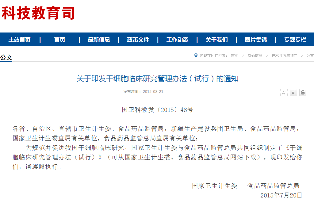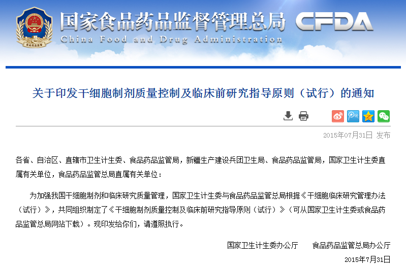 各省、自治區(qū)、直轄市衛(wèi)生計生委、食品藥品監(jiān)管局,新疆生產(chǎn)建設兵團衛(wèi)生局、食品藥品監(jiān)管局,國家衛(wèi)生計生委直屬有關單位,食品藥品監(jiān)管總局直屬有關單位:為加強我國干細胞制劑和臨床研究質(zhì)量管理,國家衛(wèi)生計生委與食品藥品監(jiān)管總局根據(jù)《干細胞臨床研究管…