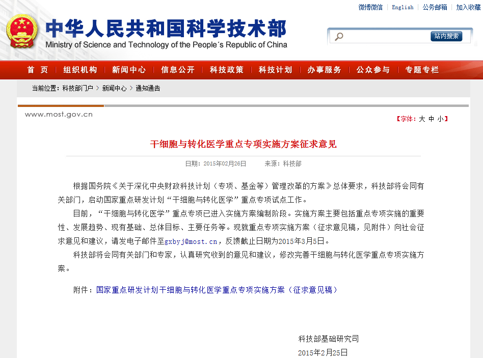 干細胞與轉化醫(yī)學重點專項實施方案征求意見 根據(jù)國務院《關于深化中央財政科技計劃(專項、基金等)管理改革的方案》總體要求,科技部將會同有關部門,啟動國家重點研發(fā)計劃“干細胞與轉化醫(yī)學”重點專項試點工作。 目前,“干細胞與轉化醫(yī)學”重點專項已進入…